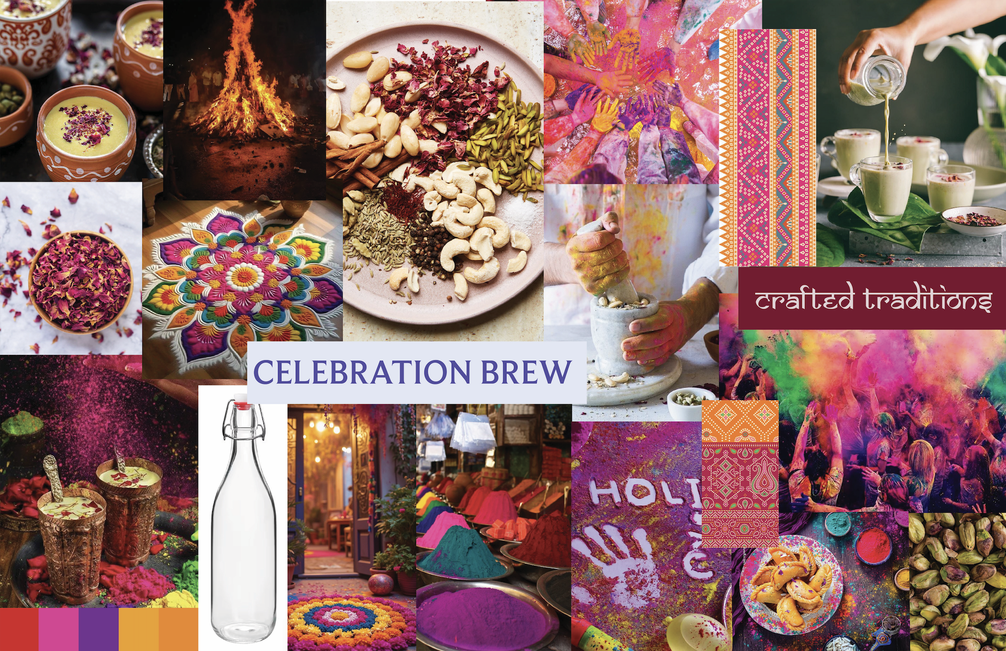 The moodboard was inspired by the festivities of India, particularly the festival of Holi. Holi is a celebration of different colors, food, and drinks which represents different facets of life.