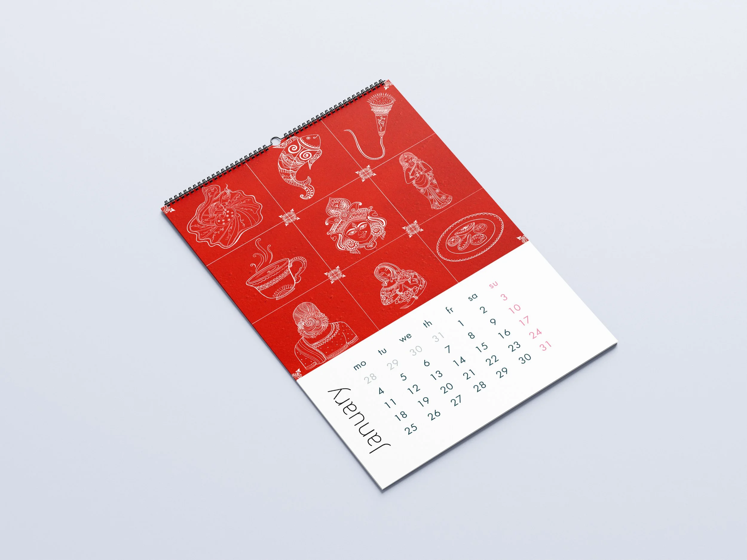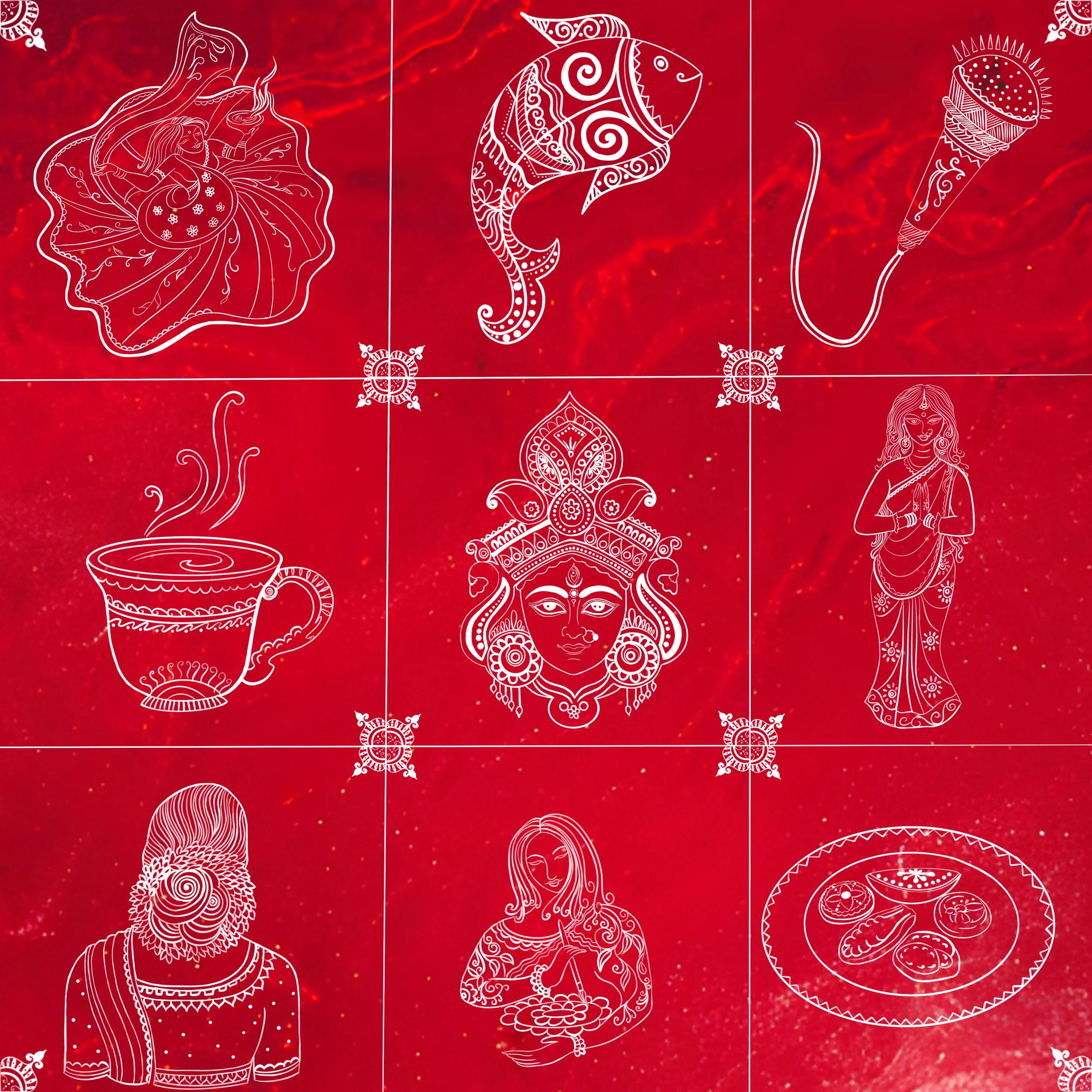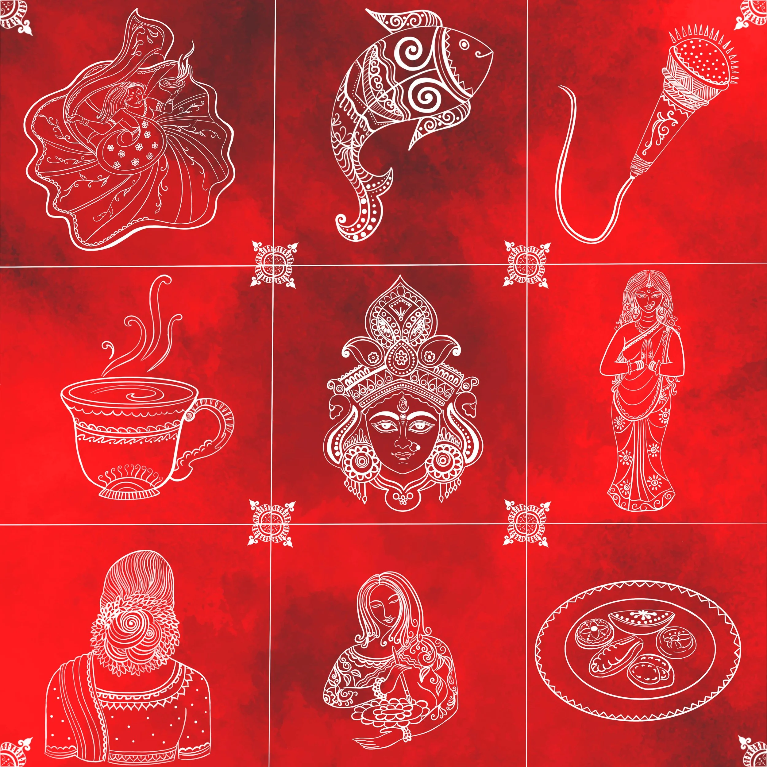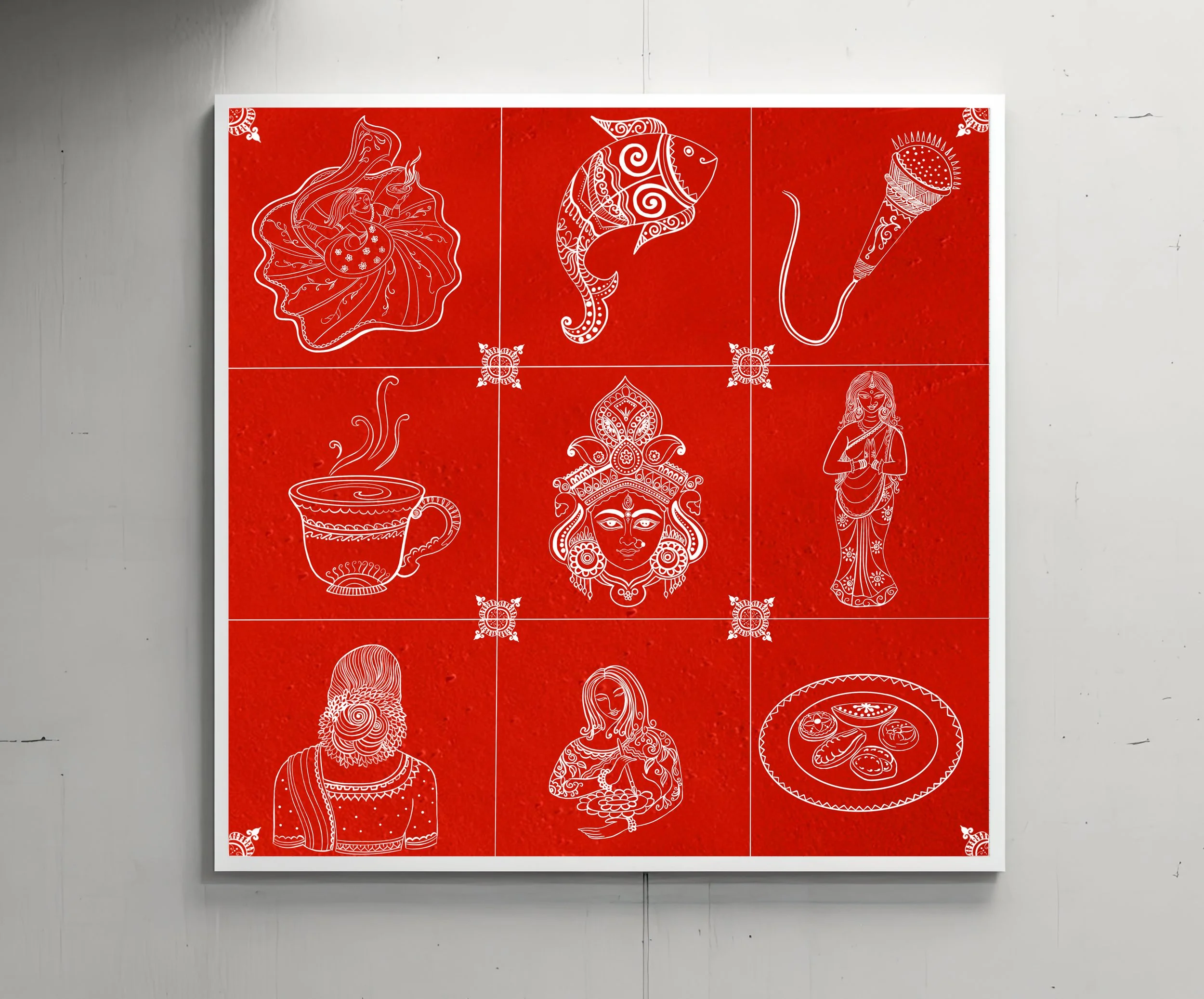 I aimed to make all the drawings consistent by creating patterns using white as these patterns are usually made on a smooth dark surface using white chalk powder or a rice flour solution that resembles white paint against a red brick wall. This inspired my choice of a red background, creating a juxtaposition of the peaceful white silhouette against a passionate red backdrop.